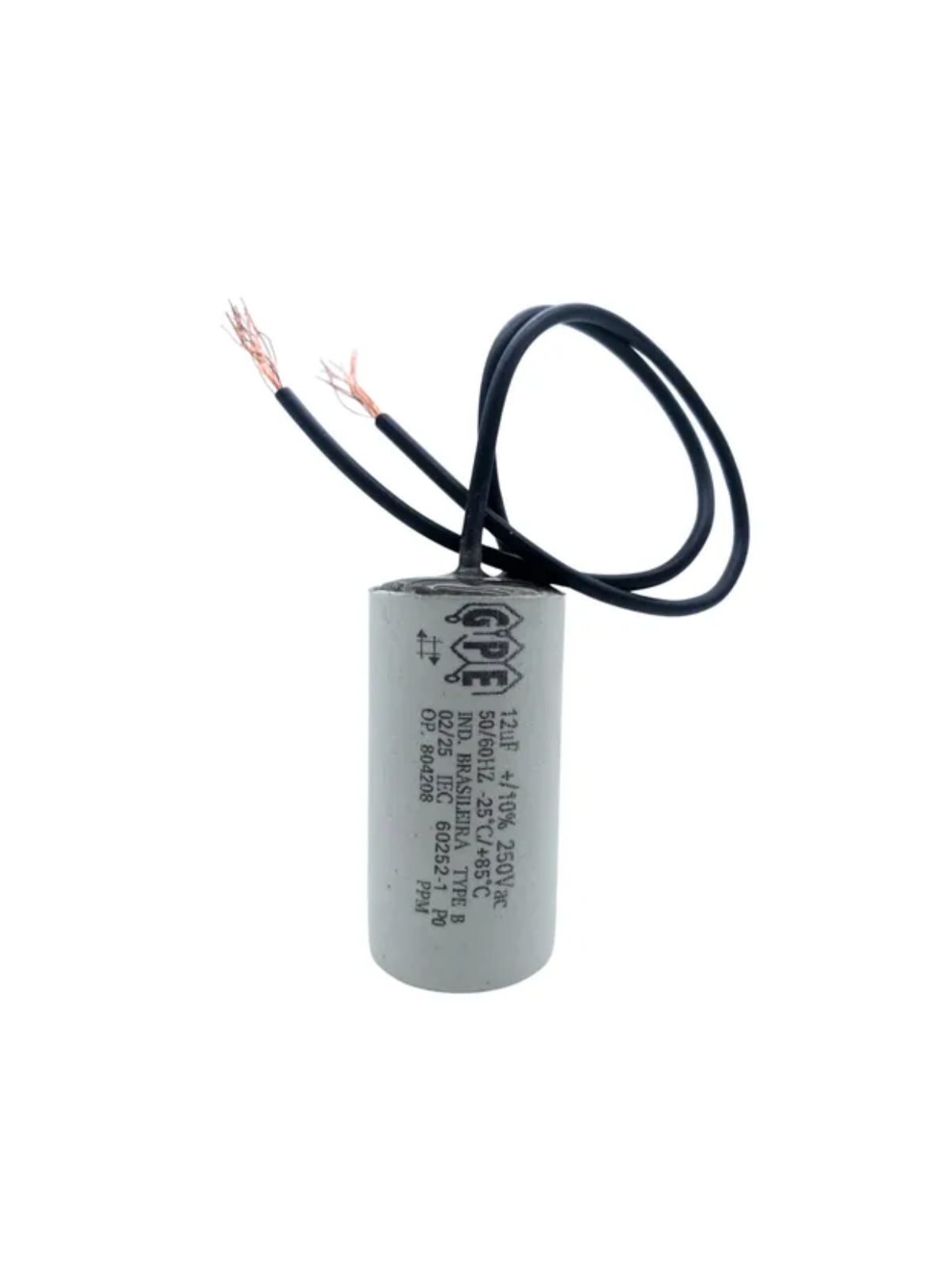 Capacitor para motor 12µF 127/220VAC, marca GPE, indicado para motores monofásicos. Auxilia na partida e funcionamento estável de equipamentos como ventiladores, bombas e máquinas elétricas. Produto com 2 fios de conexão, oferecendo boa durabilidade e fácil instalação.
