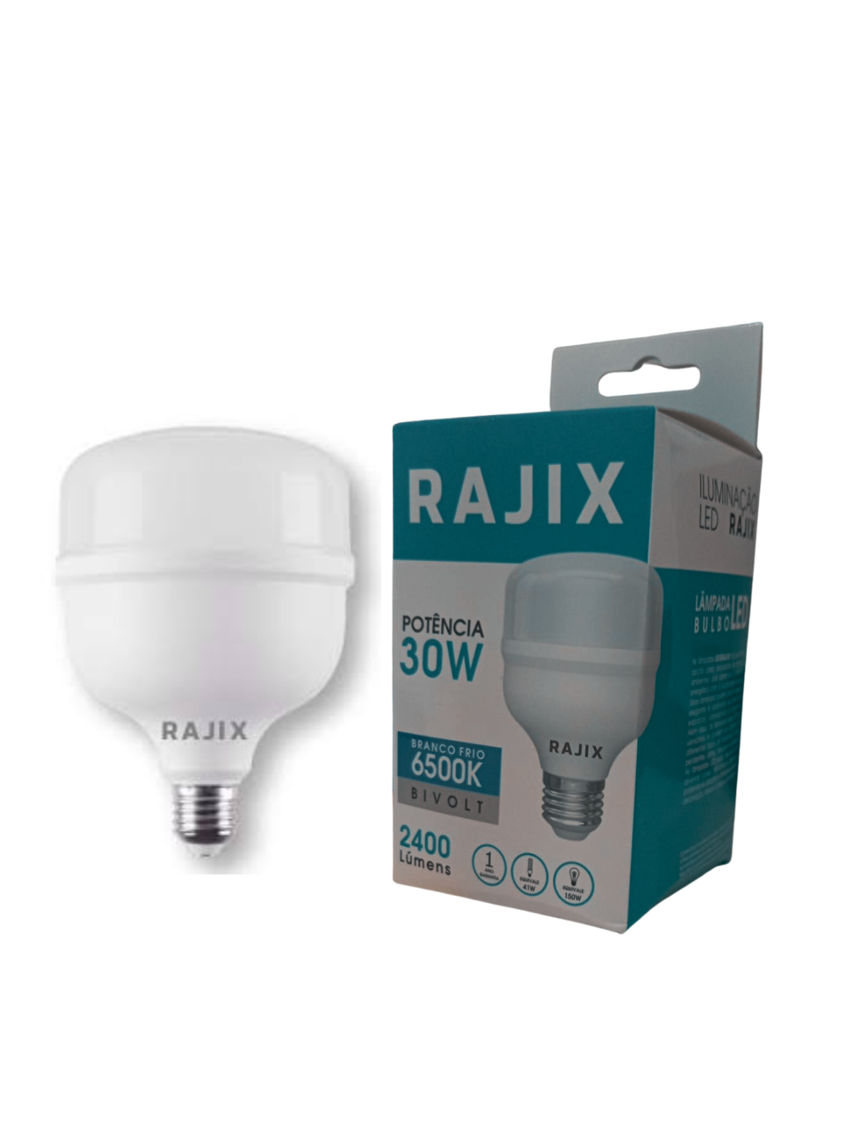 Lâmpada LED alta potência 30W (T70) bivolt com base E27, temperatura de cor 6500K (branco frio). Fornece iluminação intensa e eficiente, ideal para ambientes que necessitam de mais luz. Design resistente da Rajix, com baixo consumo de energia e longa durabilidade.